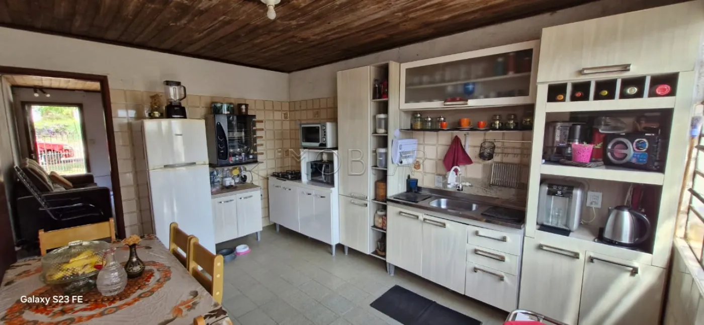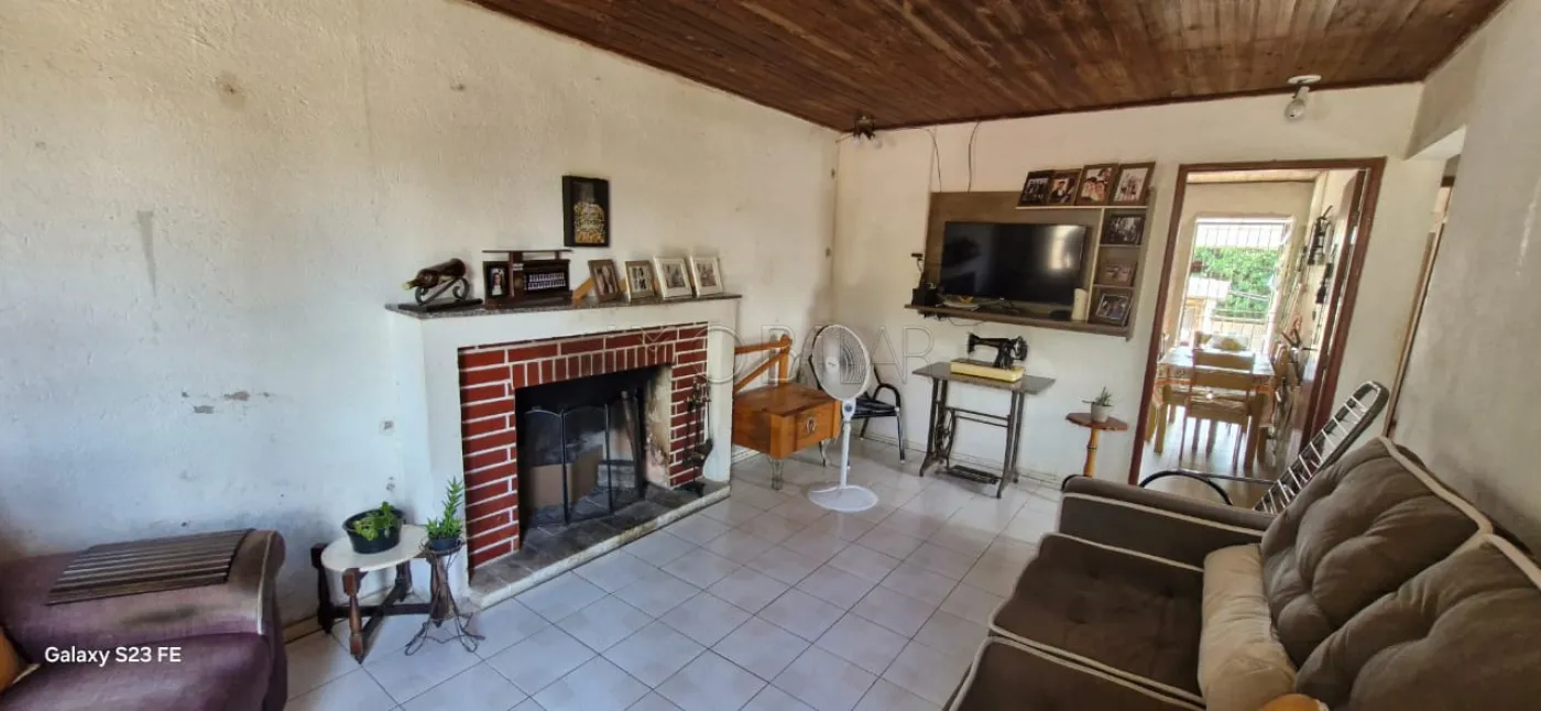 02 dormitórios, sala com lareira, cozinha, circulação, banheiro social, pátio amplo murado com banheiro, peça auxiliar, garagem fechada com churrasqueira, entrada para mais veículos, quintal arborizado.