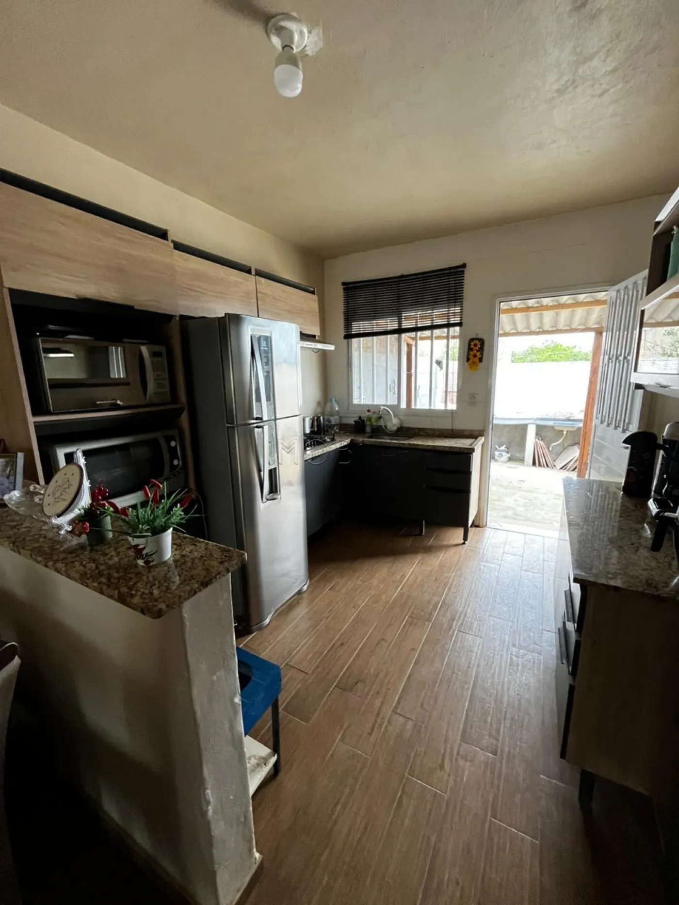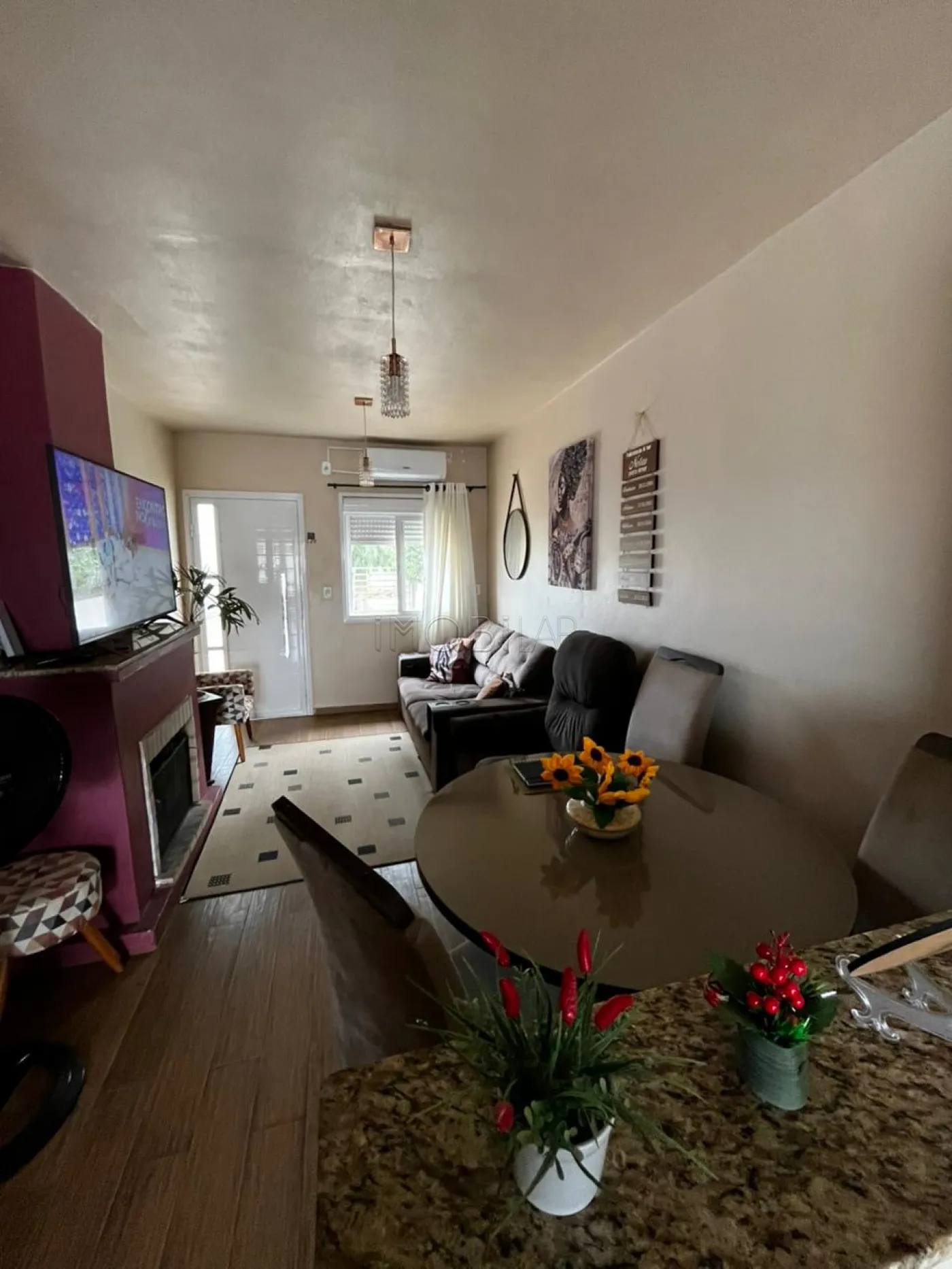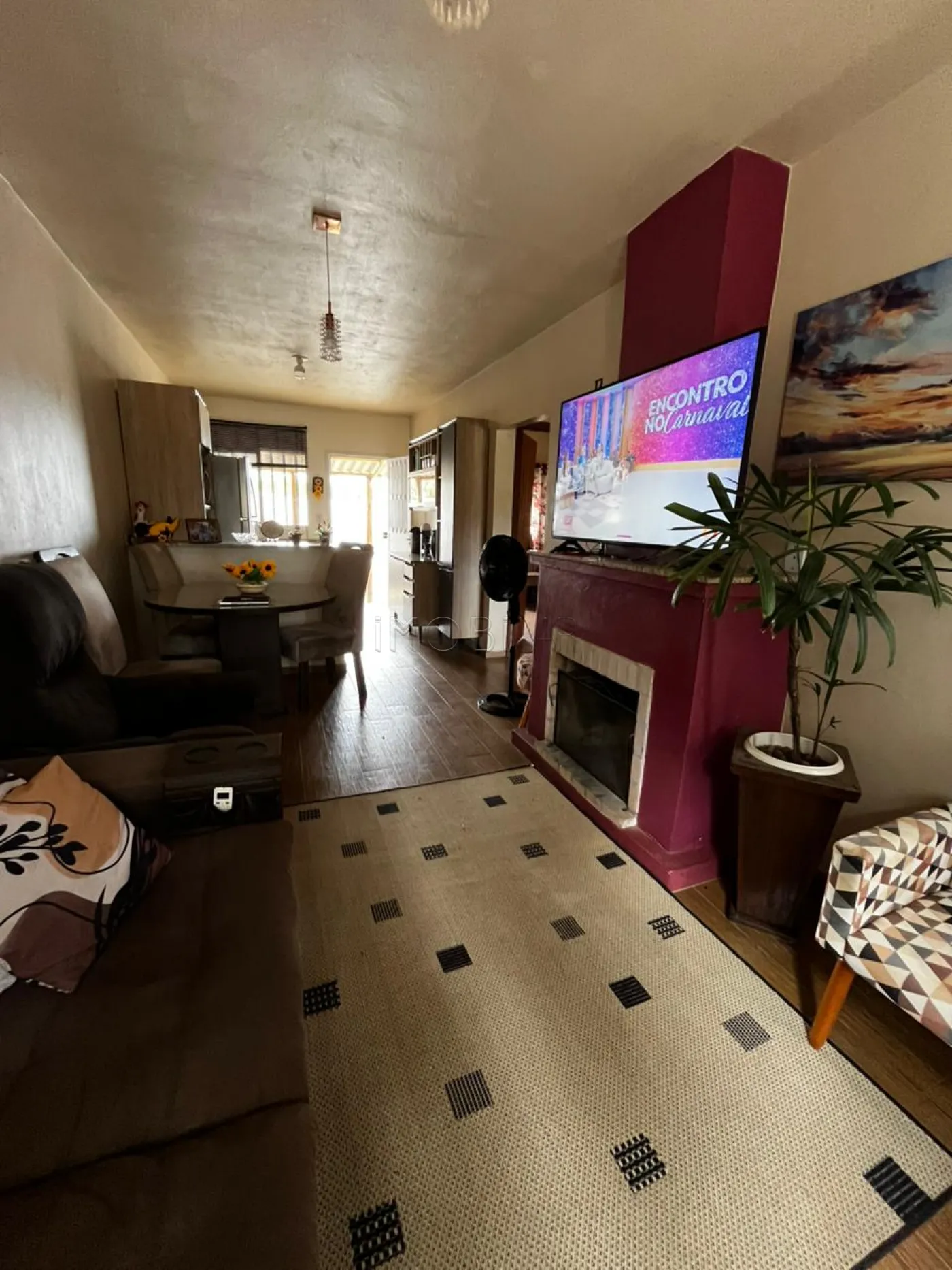 Casa com 02 dormitórios, sala com lareira e pátio.