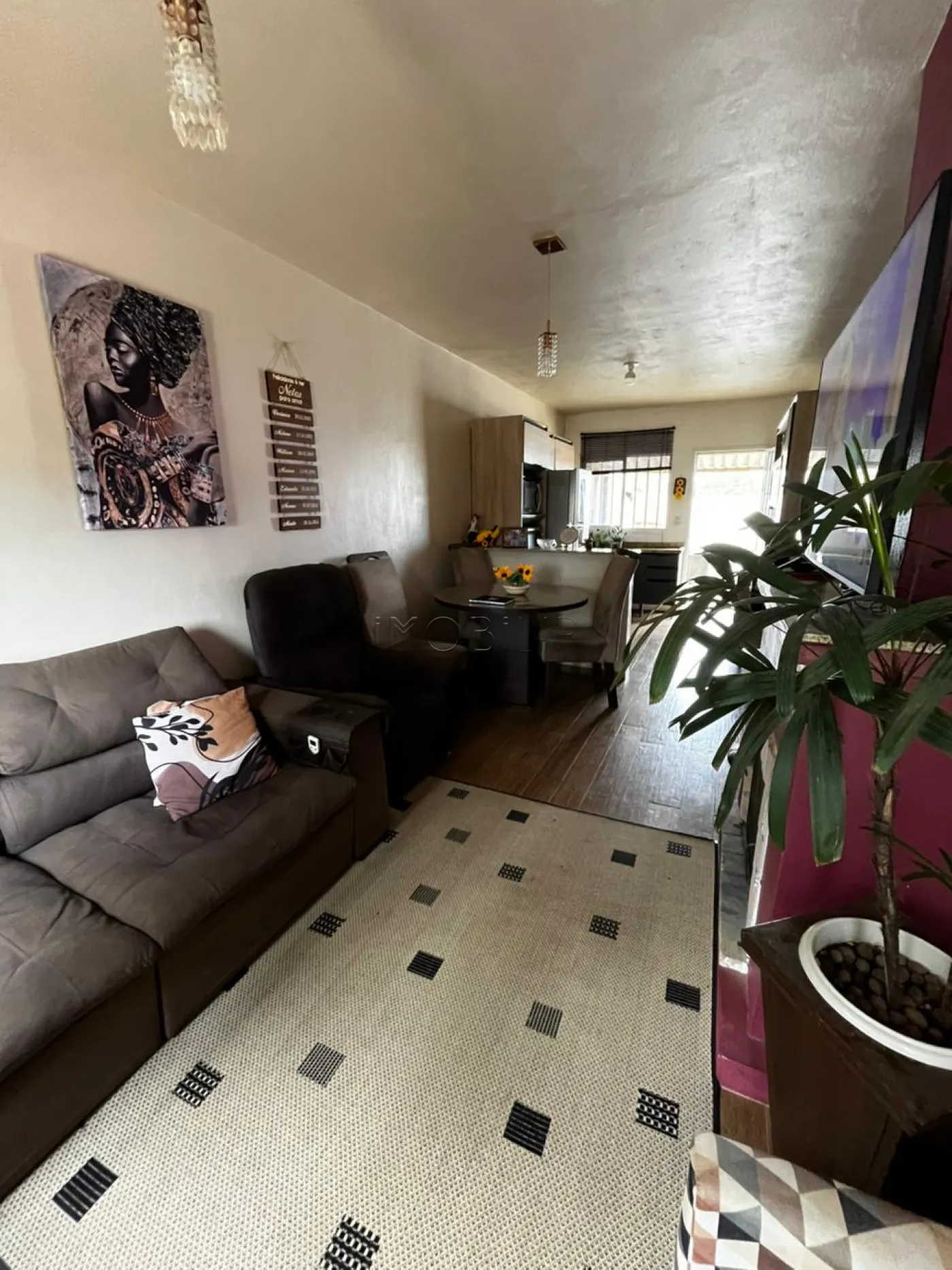 Casa com 02 dormitórios, sala com lareira, cozinha, banheiro social, área de serviço e pátio.