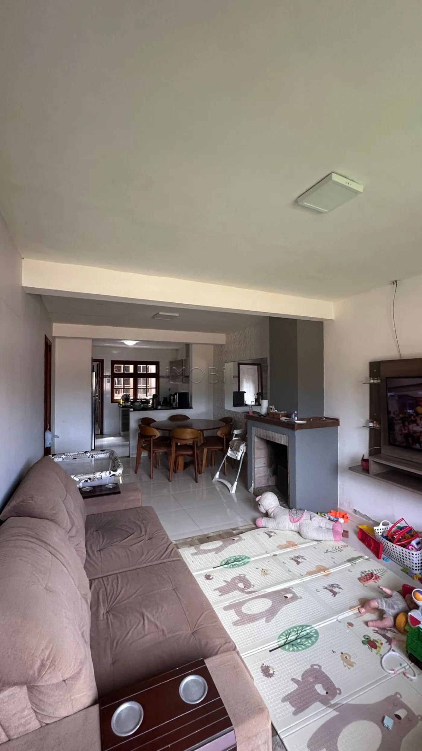 Sala de estar com lareira e cozinha integrada, perfeita para os dias mais frios;